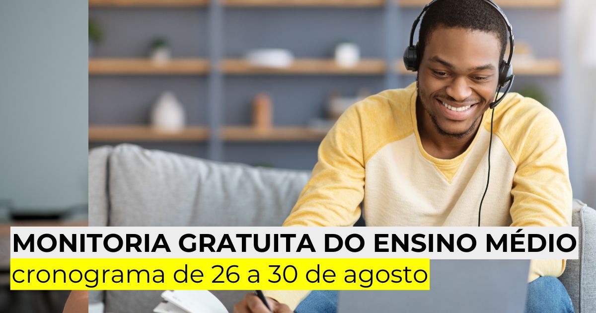 Confira o cronograma de aulas da Monitoria Gratuita do Ensino Médio para a semana que vai de 26 a 30 de agosto e programe-se para acompanhar e tirar todas as suas dúvidas!