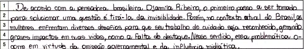 De acordo com a pensadora brasileira Djamila Ribeiro, o primeiro passo a ser tomado para solucionar uma questão é tirá-la da invisibilidade. Porém, no contexto atual do Brasil, as mulheres enfrentam diversos desafios para que seu trabalho de cuidado seja reconhecido, gerando graves impactos em suas vidas, como a falta de destaque. Nesse sentido, essa problemática ocorre em virtude da omissão governamental e da influência midiática.