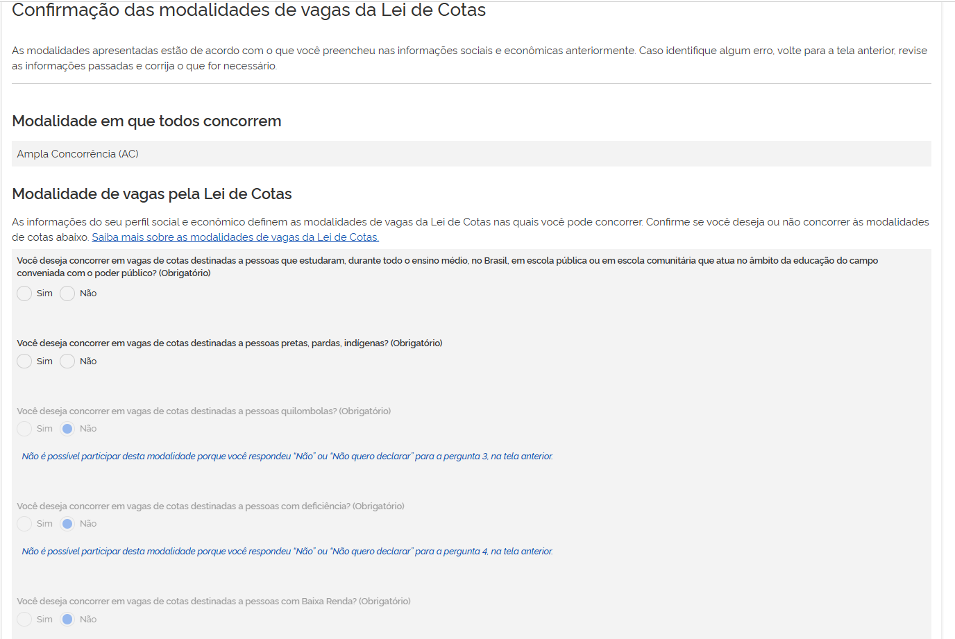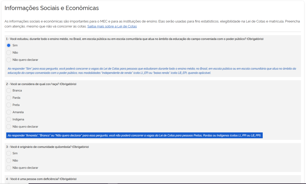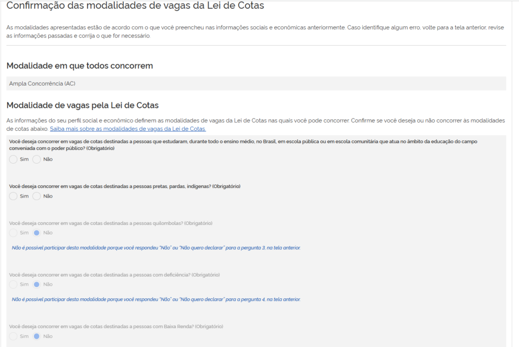 - cotas, conforme a Lei de Cotas (escola pública, renda, raça, deficiência, entre outras).