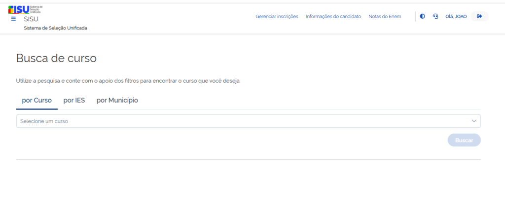 O sistema permite selecionar duas opções de curso, em ordem de preferência. É possível filtrar por: