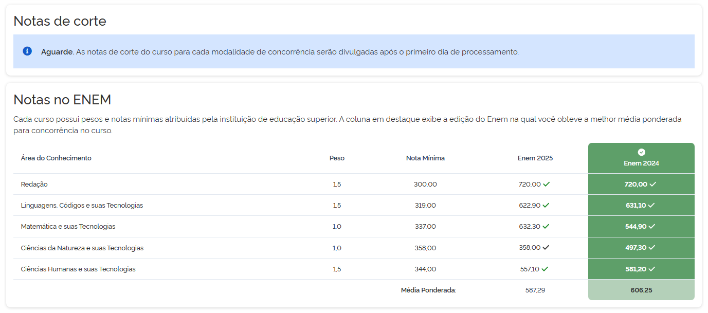 Isso significa que a mesma nota no Enem pode gerar médias diferentes, dependendo do curso escolhido.